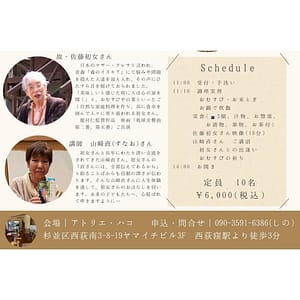 イベント詳細 日付: 2025-02-20 11:00 – 14:00 カテゴリ: Non active すなおさんと結ぶ初女さんおむすびの祈り 2月20日(木)11:00 - 14:00 講師:山﨑直(すなお)さん 定員:10名様 参加費:6,000円(税込) お問い合わせ先:篠恵美子さん https://www.instagram.com/e.shino2020?igsh=ajlnMnhnNnRqM3lh カテゴリー: